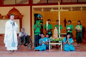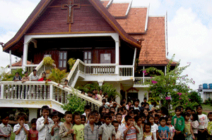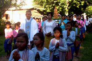 The youth of the parish gave us a little of its history. The "settlers" of the village returned from the refugee camp in Thailand after the Pol Pot regime. At that time, only two families were Catholic and they had to go Battambang for mass. They requested a church to be built. Thus, the first church was a very simple house of God. However, as the village grew, the church grew as well. There are 82 baptized Catholics today. Therefore in 2003, a bigger church, stunningly beautiful, was built.