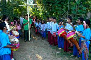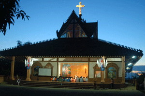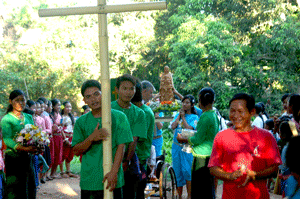 At 9 am, Fr. Gabriel, SJ gave us a lift to Tapung village and arranged for transport to send us to Tahen village in the later part of the afternoon. On the way to Tapung, we stopped to pick up some candies for the children. When we arrived at the parish, we saw many bicycles parked there. We thought that there must be a big event going on. When we stopped and looked up at the church, we saw a big welcoming committee. A large group of children were all waiting there. Thus out came our cameras. It was a Kodak moment!