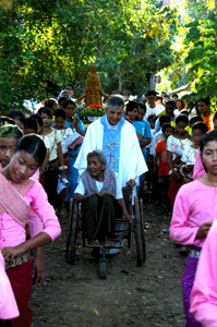 Msgr Kike wheeling "the Lady of the Faith" at the head of the procession to the Church