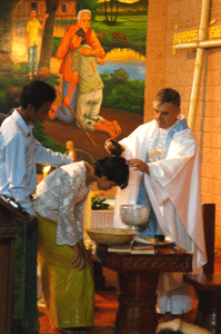 We were invited to attend a baptism mass at 4.00 p.m. in Tahen Village. Since we arrived earlier than scheduled, we hung out with our students. Sokhorn and Chy Thy taught us the first five consonants of the Khmer language! Yes, we have made very little progress with the language. The mass was delayed and it only started at 5.00 p.m. with a procession from an 84-year-old lady's house who had kept her faith during the time of the regime.