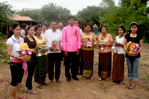 We arrived in Chom Naom village at Liam's house and joined in the procession. Liam, the groom was flanked by his parents and immediate relatives, bearing gifts for the bride.