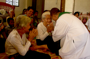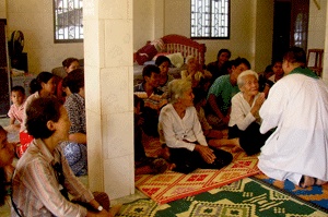 Once a week, Kam Thong would visit this new community for prayer and catechism lessons. One of the priests would go along if available and mass would be celebrated. On weekends, one has to get in early to get a place. It looks like a Church will have to be built in the near future! The third baptised Catholic is a young man (behind the 2 old ladies), baptized as a child but yet to be confirmed. Prior to the return of his grandmother he had never attended mass. Before mass began, Fr. Totet taught the assembly how to make the sign of the cross, the correct gestures before the proclamation of the Word and the meaning and significance of the different parts of the mass.