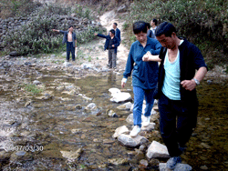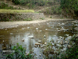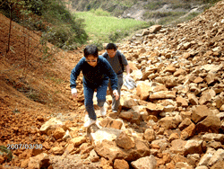 On 30 March 2007, Jamie from NCL and I left at 10.30 a.m. in the NCL vehicle for San He village. After our lunch at Mao Chan, we traveled another half an hour before we arrived at Da Ying. San He was still another 8 km away. We left the car there to continue the rest of the journey on foot. We crossed a small river using stepping-stones. It was hot that day, about 30 degrees Celsius. Under the sweltering heat, we walked the treeless path that snaked its way up and down the mountain. After half an hour, we came across a rocky path. Again we had to climb the path, making our way up and down the mountain, this time through the trees until we reach the top. We had been climbing for more than an hour and I was totally worn out and breathless by this time. From the top of the mountain, the people pointed out to us that the bridge was somewhere near the school. They had no intention of taking us all the way to see it. I realized then what our liaison officer Mr. Lu meant when he told me that we had to walk for an hour. I insisted that they take me to see the bridge as I had to take some pictures of the place for the report to RBCS. They tried to dissuade me by telling me that it would take another hour to get there.
