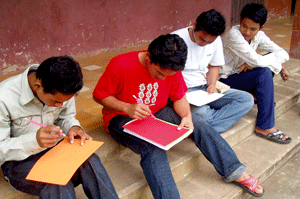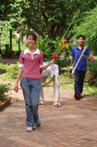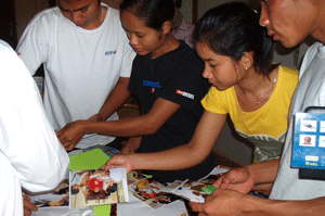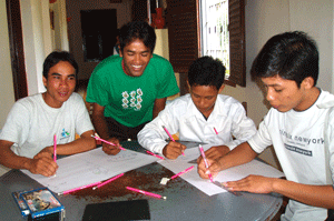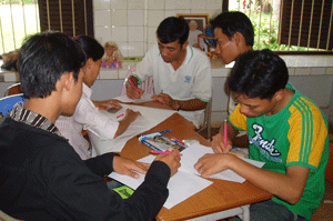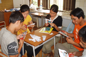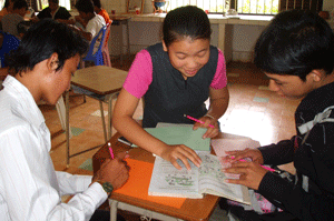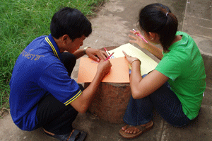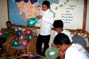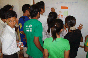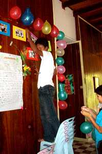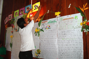 Graduation project (Preparing for the Certificate Awarding Ceremony) was the theme of the last session. The students were split into five groups and they had different tasks to do – one group was in charge of the balloons (balloons are expensive here, US$0.07 for one), another group had to gather flowers from the garden and the third group had to display the different stories done to date on the wall.