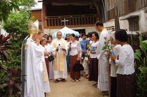It was a major feast day celebrated in honor of Our Lady, the patron Saint of the church with procession and dancing followed by High Mass concelebrated by the Prefect Apsotolic and 3 priests. Fr. Bruno Cosme, MEP from the St. John Mary Vianney Major Seminary in Phnom Penh gave the sermon. Representatives from the different provinces participated in the celebration. It was a joyful and colourful event. Many faithful and on-lookers with cameras in hand lined the street to take in the sight and to take mementos of the procession.